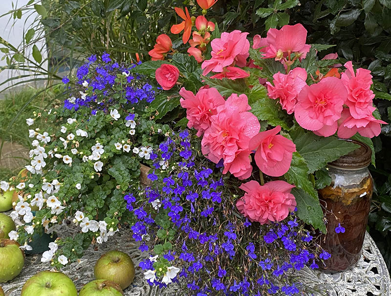 And, of course, the completely unstopable non-stop begonias! Squashed into pots on the relatively shady garage patio they have flourished, but out in the border they obviously felt much too exposed and have all but withered away. (Also note a tiny sample of our massive crop of Bramley cooking apples…. It has been an incredible year for fruit and my freezers are bulging with stewed apples, just from the windfalls.)
