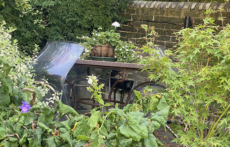 Ten days ago, as you can see, the cosmos were still flowering as were the penstemon, the antirrhinums, the roses and the geranium Rozannes. Now all that remain are a few roses, the ever faithful Rozannes – and the white geranium and bacopa hanging basket that finally gave up trying to hang anywhere as there was nowhere suitable and took up residence on the patio table.