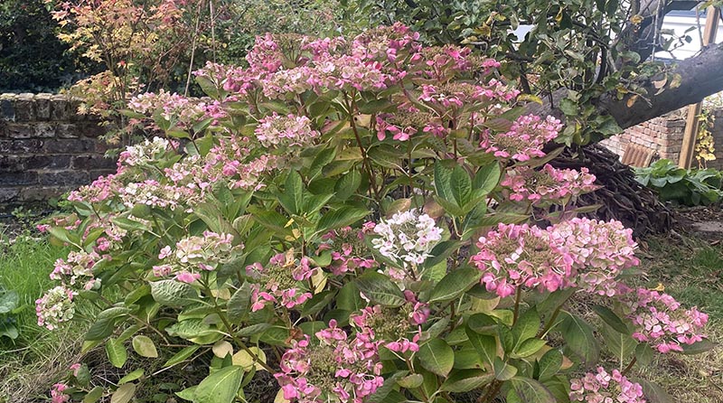 And then the hydrangea. Apart from one unkillable pink Japanese anemone, this is the only plant which remains from the original garden – and it is very fine. A mighty bush with glorious white lace-cap flowers in the summer which go this wonderful musty pink in autumn.