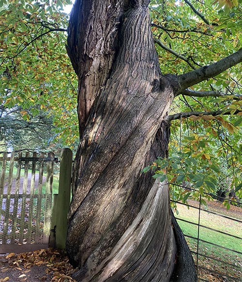 Some huge sweet chestnuts with their characteristic swirling trunks.