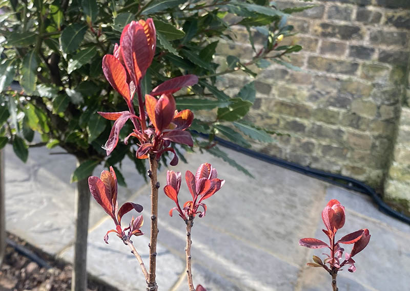 The big border around the patio, thanks to the regrowth of the pollarded poplar behind it, does not get that much direct sun so is a bit slower to come back to life. But here are the macaleyas, the cotinus and the geranium Rozannes all sniffing the air to see if spring is really on its way.