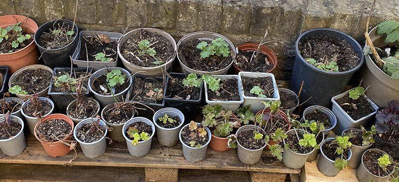 Not only generous in their colours, their flowering time and their general jolliness – but happy to give and give in terms of off shoots when you split them after a couple of years. Here are just some of the pots with roots of both heuchera and alchimella mollis, all of which will be for sale on our opening day on June 21st!