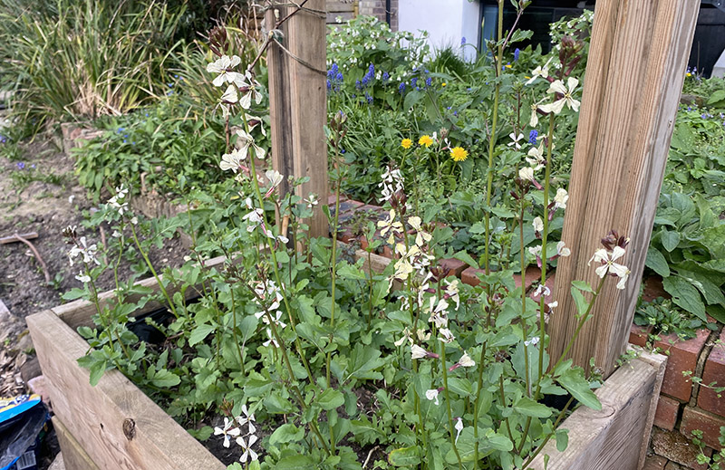 By that time the rocket in the Growing Garden had gone to seed and the dandelions, muscari and comfrey in the wild garden were just getting into their stride – helped by the fairly vigorous pruning we had given to the apple tree above them with my wonderful new extending handle (to 4.7 meters…) tree saw.
