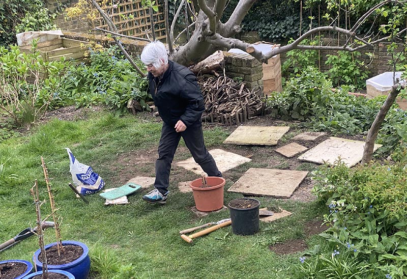The idea was to repave the area under the apple tree where the grass has really struggled, not helped by the pigeons hoovering up the birds’ discarded bits. And here is Sue in full paving mode. (Everyone is very sniffy about our ‘paving’ as we refuse to use cement to bed the stones in, just sinking them into a decent layer of sand in the grass. This does mean that they can crack, but it also means that you can move them if you decide you got it wrong – which seems of much greater benefit to me.)